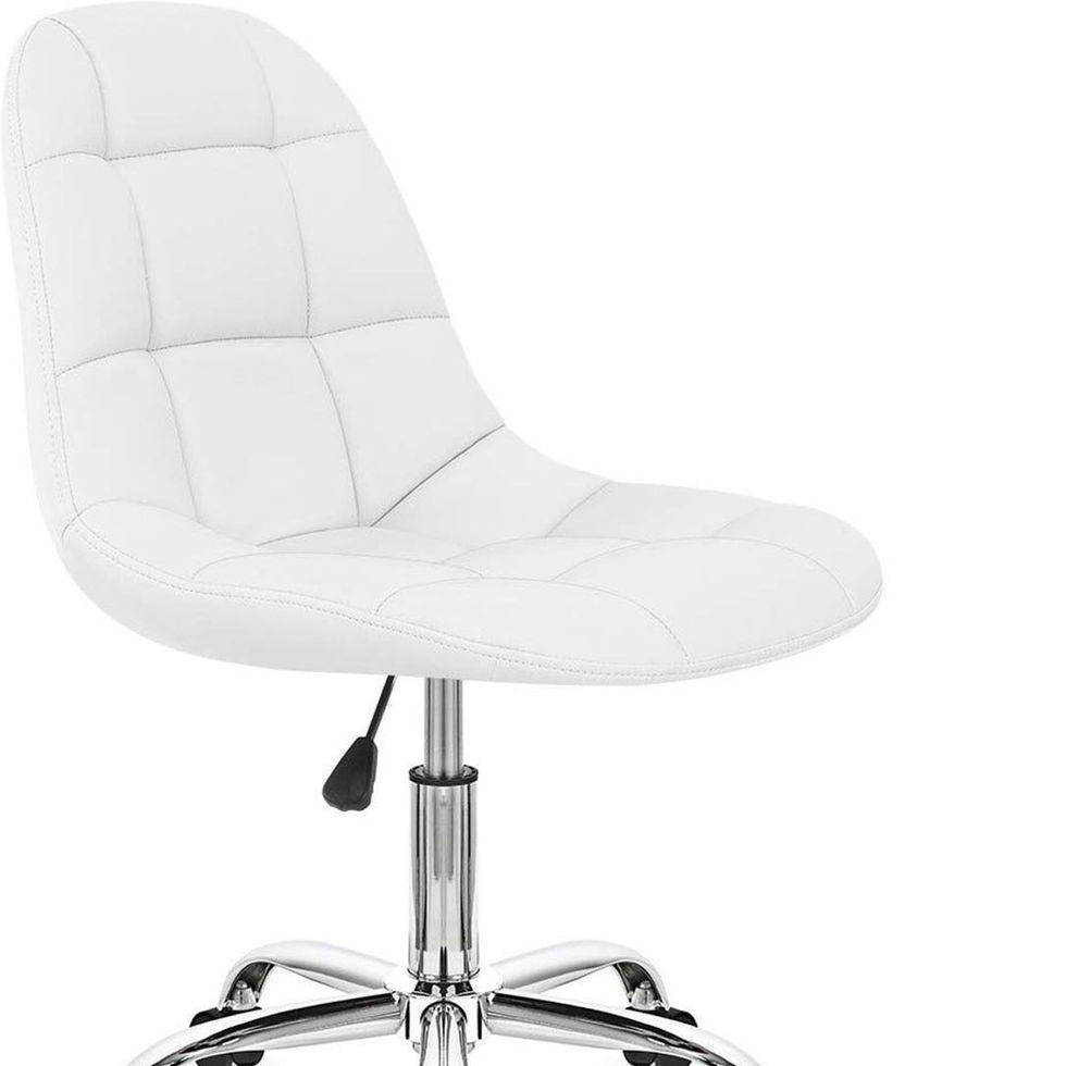 The chair features a stylish egg-shaped low-back design that offers comfortable support while maintaining a sleek, compact look. Upholstered in premium white leatherette with cushioned foam padding, it provides a smooth, comfortable seating experience and is easy to maintain.